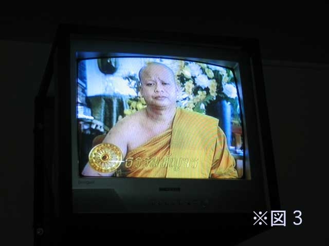 かくして、歯が溶けるかと思うほど甘すぎるオバルティンと同じく甘すぎるデザート(図2)にふたたび具合を悪くし、早々に宿に引き上げ安静にして明日の旅立ちにそなえる。テレビでは苦々しい顔をしたお坊さんが、だらだらとありがたそうな話をしている(図3)。