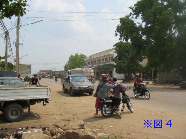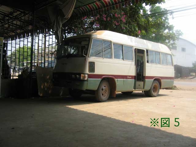 同郷店先のペプシの業務用冷蔵庫がやたらめだつこの茶色っぽい街(※図4)は、発展しているようで案外変わらない。さて、適当な若者と口頭の契約をかわし、いつも通り客がそろうまで、数時間待たされたのち、ドアに「自動扉」とかかれた退役バス(※図5)に詰め込まれた。よお、同郷。がんばってるな。