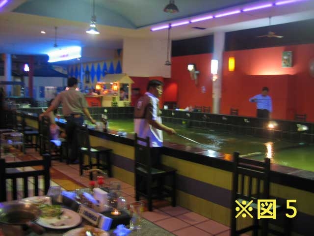 しかしあんだけ、あんだけジェスチャーつけて言ったのに、運転手は釣り堀のちょっと粗末な建物をすぎ、豪華絢爛なレストランの前に車をつけた。金を払って降りた瞬間、すかさずボーイと、キレイなねえちゃん2、3人に満面の笑顔で迎え入れられたため、あわてて「あ、あのう、違くて、エビ釣りにきたんだけど」とまたもジェスチャーを交えて伝えると、1人のねえちゃんがタクシー運転手と同じ顔して