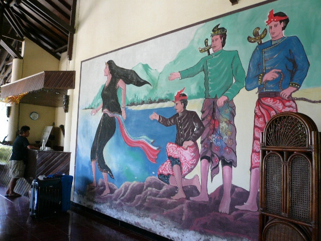 いつもガラガラのレストラン兼ロビーには、ど~でもよさそうな表情の人たちのでっかい絵が掲げられている。ものすごく重要そうなシーンなのに、ひどくど~でもよさそうだ。東南アジアの人は、絵心のない人が多いと思う。バンコクのドゥシット動物園の壁画などを知っている人はわかると思いますが。