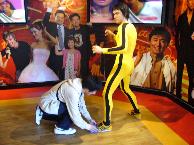 世界的にも有名なあの方のお靴を磨かせていただくという大仕事を、ありがたく仰せつかっている場面です。写真待ちしてた香港の人、腹かかえて大爆笑。オイシー!!これ以上の蝋人形がみたかったら、2000円弱の入場料が別途必要ですが、後ろのジャッキーとか見るとわかるように、値段とマダムの迫力ある生い立ちの割に似てないので、ツッコミ代として割り切ってあげてください。