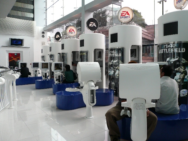 しかしピークタワー途中のフロアにて、最新ゲームお試しコーナーがあったので、全員お互いの了承を得るまでもなく、散ってゲームスタート。スタッフも何人かいるが、特に監視しているわけでもないのでタダでやり放題。 しかも空いてる。こんなとこまで来てゲームやる観光客もいないよな。ここにいるけどな。
