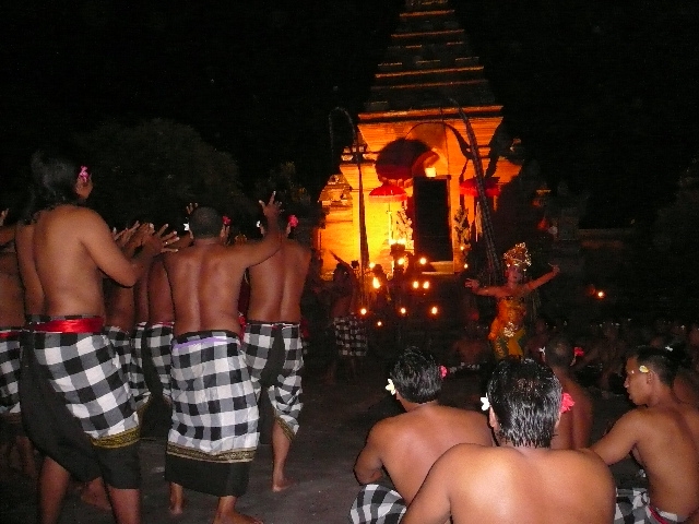 男たちの間をぬって、女性が、偉そうな人が舞い、踊りはクライマックスを迎え、ケチャのリズムもだんだんと速くなり、男たちは立ち上がり、踊り、大きな渦をつくり、そしてトランス状態に入る…。