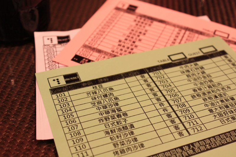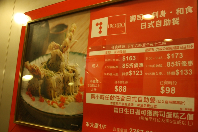 iroiroという店。日本食か…いやまて、きょう日、絶対に香港でしか食べられないものといえば、「香港の日本食」ではないか!と驚愕の事実に気付いた我々は、短期旅行者のくせに日本料理食べ放題のその店に入ったのであった。